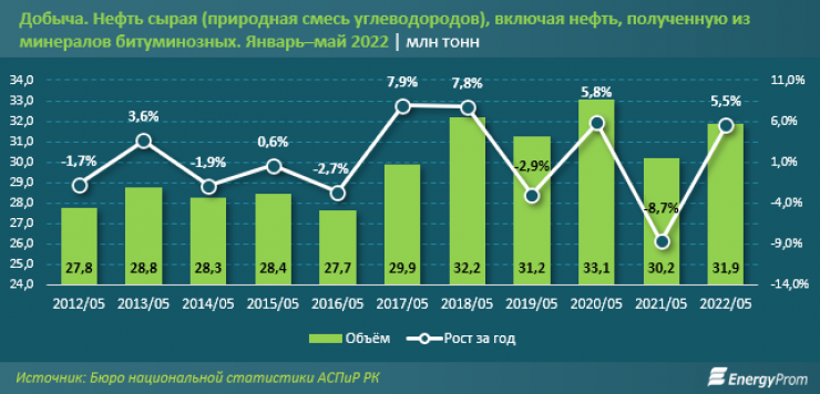 Добыча в Казахстане сырой нефти, полученной из битуминозных минералов, с января по май этого года выросла на 5,5 процента в сравнении с прошлым годом и составила 31,9 миллиона тонн.