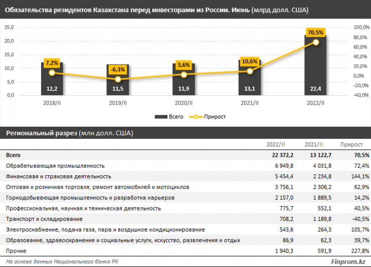 К 1 июля текущего года объем обязательств резидентов Казахстана перед инвесторами из России увеличился сразу на 70,5 процента за год, до 22,4 миллиарда долларов. Большая часть инвестиций из России пришлась на обрабатывающую промышленность: 6,9 миллиарда долларов, плюс 72,4 процента за год в стоимостном выражении.