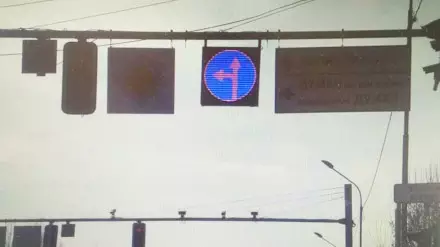 Информация на табло меняется в зависимости от времени суток. С 6.00 до 11.00 на нем указано, что движение разрешено только прямо - знак 4.1.1 "Движение прямо". С 11.00 до 6.00 разрешается ехать прямо или налево - знак 4.1.5 "Движение прямо или налево".
