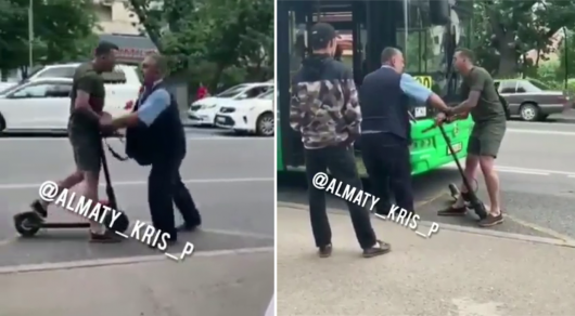Другой подобный инцидент произошел 9 июля. Алматинец на самокате сначала напал на водителя автобуса. А после, когда пытался уехать с места происшествия, попал под колеса джипа. Все происходило на автобусной остановке. Случай вызвал широкий общественный резонанс. В конечном итоге водитель автобуса и самокатчик примирились.