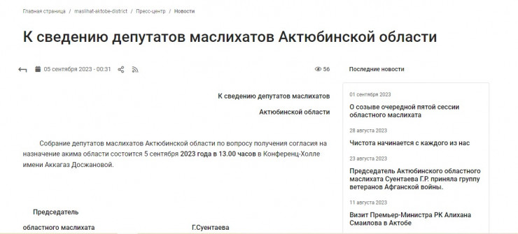 Как стало известно, 5 сентября в Актобе состоится заседание депутатов маслихата, где будет обсуждаться вопрос о согласии на назначение нового акима региона.