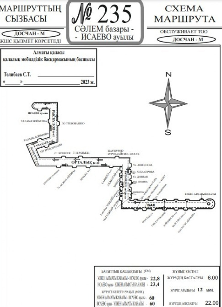 Новый пригородный маршрут № 235 курсирует между рынком "Салем" и поселком Исаев в Илийском районе. Транспортное обслуживание на данном маршруте осуществляется 10 автобусами малой вместимости марки ISUZU Н-40 с интервалом движения 12 минут.