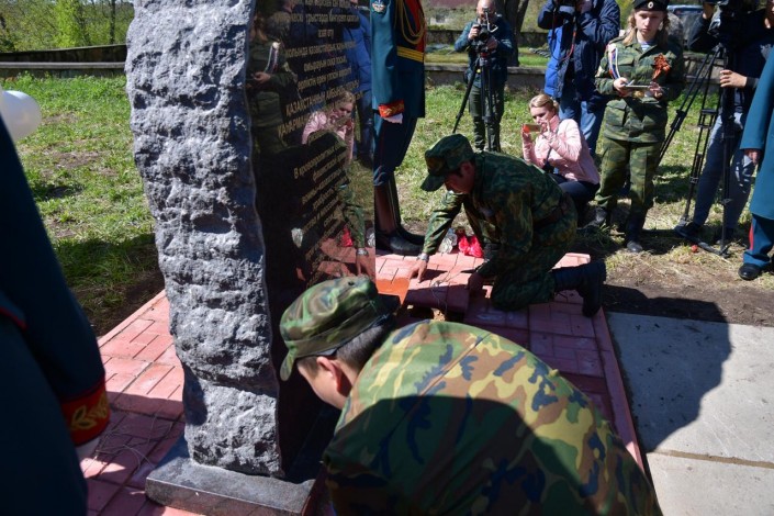 У подножия памятника поисковики заложили металлическую капсулу с горстью родной земли из Казахстана.