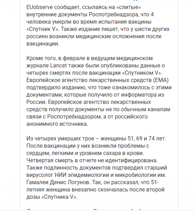 Эту информацию уже опровергли представители НИИ эпидемиологии и микробиологии имени Гамалеи. По словам старшего вирусолога НИИ Дениса Логунова, во время клинических испытаний вакцины смерть 51-летней женщины действительно была зафиксирована, однако результаты расследования показали, что кончина не была связана с введением препарата.