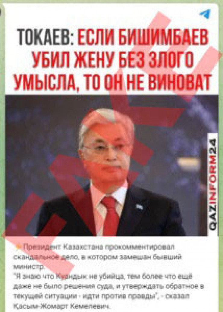 В Казнете рассылают фейковое сообщение с цитатой от имени Президента Касым-Жомарта Токаева. В подписи сказано, что таким образом Глава государства "прокомментировал скандальное дело, в котором замешан бывший министр", передает Tengrinews.kz со ссылкой на Stopfake.kz.