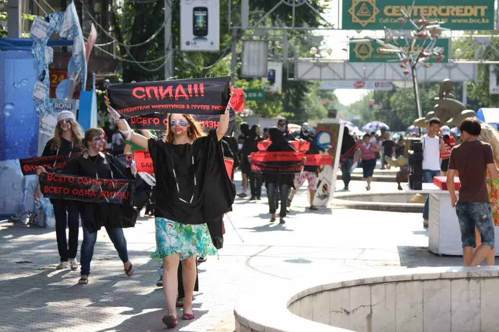 Во Всемирный день борьбы с наркоманией на Арбате в Алматы прошел флешмоб "Зомби против наркотиков", передает корреспондент Tengrinews.kz