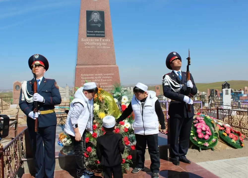 ФОТО: На могиле погибшего при теракте в Таразе полицейского установили монумент Церемония открытия монумента погибшему при теракте полицейскому Газизу Байтасову. Фото пресс-службы ДВД Жамбылской области.