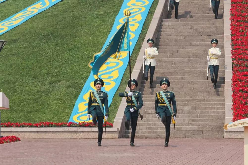 Назарбаев поднял в Астане главный флаг Казахстана, передает корреспондент Tengrinews.kz. "20 лет назад, в 92-м году, я подписал Указ о государственном флаге Республики Казахстан. С того самого дня наш флаг стал важнейшим атрибутом нашей независимости. И сегодня, по традиции последних лет, в канун одного из основных, одного из важнейших, красивейших праздников наших - Дня нашего города, Дня Астаны, мы поднимаем флаг в честь этой даты, и в этот же день мы вручаем погоны лучшим выпускникам высших военных учебных заведений нашей страны. Всех выпускников мы поздравляем сегодня с этой большой датой в их жизни, и лучшие из пяти высших университетов находятся здесь. Вручая им погон, я в то же время делаю напутствие всем нашим офицерам. Прежде всего, вы должны с честью носить звание офицера, хранить честь, достоинство свое, нашего государства, беречь наши границы, спокойствие мирной жизни нашей страны и нашего народа. Мы - государство мирное, строим мирные отношения со всеми. В то же время, мы знаем, что страна независимая должна иметь Вооруженные силы. Я надеюсь, что вы будете отцом, старшим братом для молодых солдат, которыми вы будете командовать и учить. Эти два важных события - подъем флага, День нашей столицы, вручение чинов, погонов лейтенанта - это важное событие в нашей стране. Этим мы запускаем все мероприятия, посвященные Дню нашего города, Дню нашей столицы", - сказал на церемонии Президент Казахстана. Государственный флаг Казахстана в самом центре Астаны имеет размер 15 на 30 метров и возвышается над городом на высоте 111 метров, что позволяет видеть его из любой точки города.