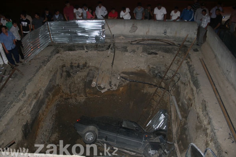 В вырытый ремонтной бригадой котлован на пересечении проспекта Рыскулова и улицы Тлендиева в Алматы угодил очередной автомобиль. На этот раз в яму глубиной около 10 метров упала машина марки Volkswagen.