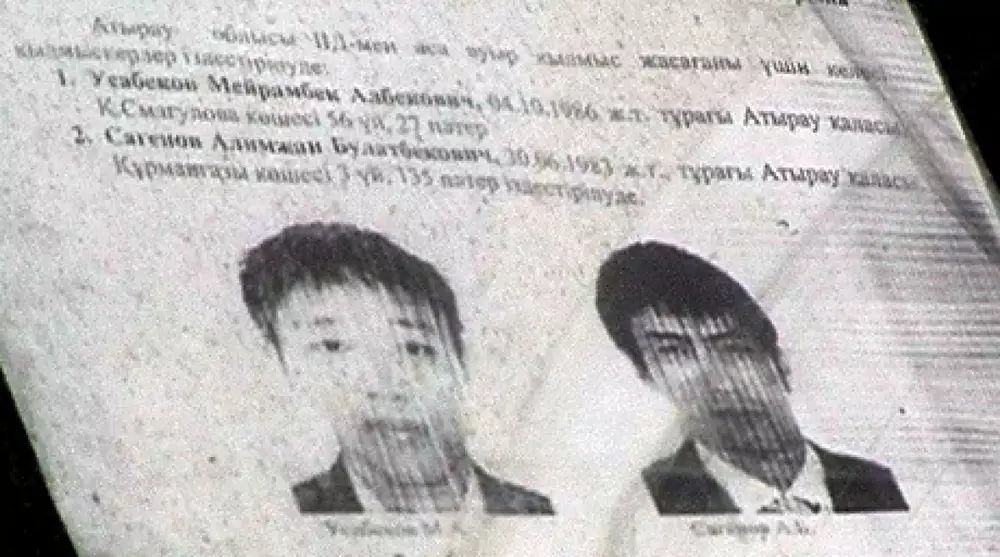 Полицейские получили ориентировки на 28-летнего Алимжана Сагенова и 25-летнего Мейрамбека Усабекова вчера, 1 ноября. По данным силовиков, они могут быть причастны к недавнему теракту, который произошел утром 31 октября в Атырау. По данным телеканала, один из них ранее уже был задержан в Атырау, а другого разыскивают в соседних областях.