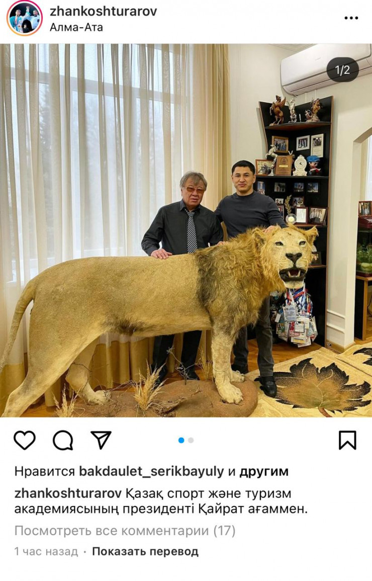 Фото с Кайратом Закирьяновым выложил в Instagram спортсмен Жанкош Тураров. На снимках показаны шкуры и чучела льва, рыси, барсов и птиц, на фоне которых мужчины фотографируются.
