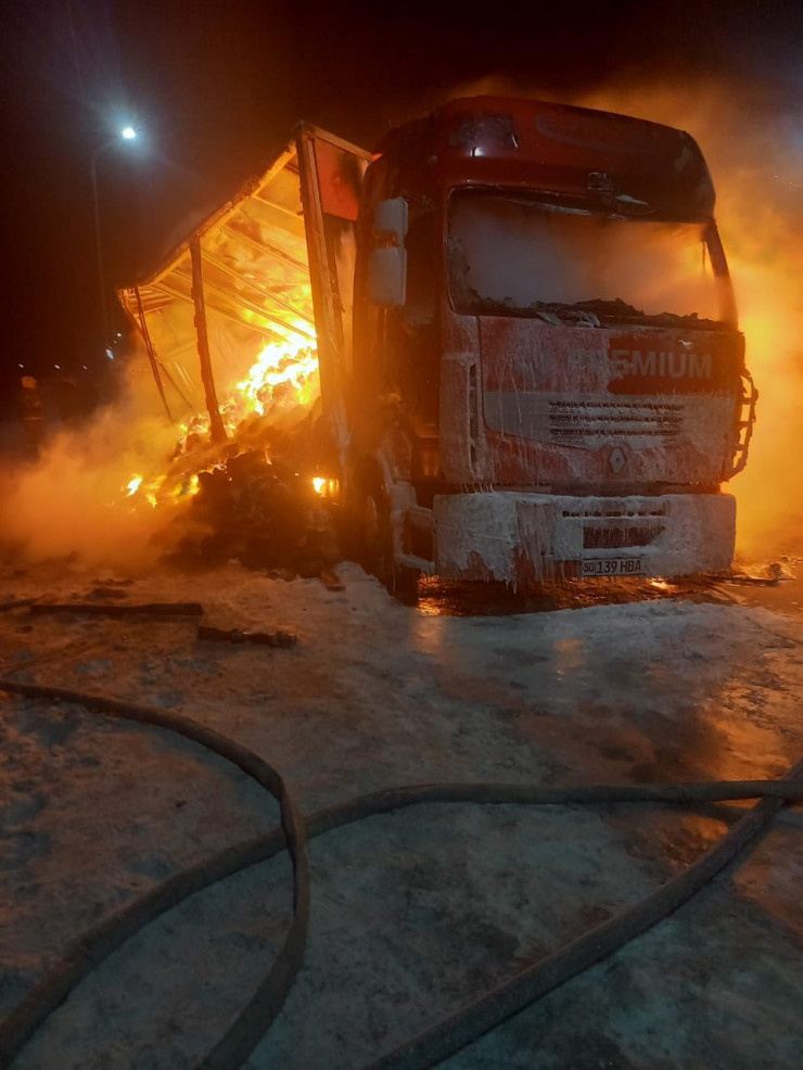 На кадрах видео, снятого очевидцами, видно, что из-за пожара на трассе возникло скопление автомобилей. С места пожара эвакуировали двоих водителей грузовика. Их доставили в пункт обогрева поселка Калкаман. По информации ведомства, пламя удалось полностью ликвидировать в 05.00, жертв и пострадавших нет.
