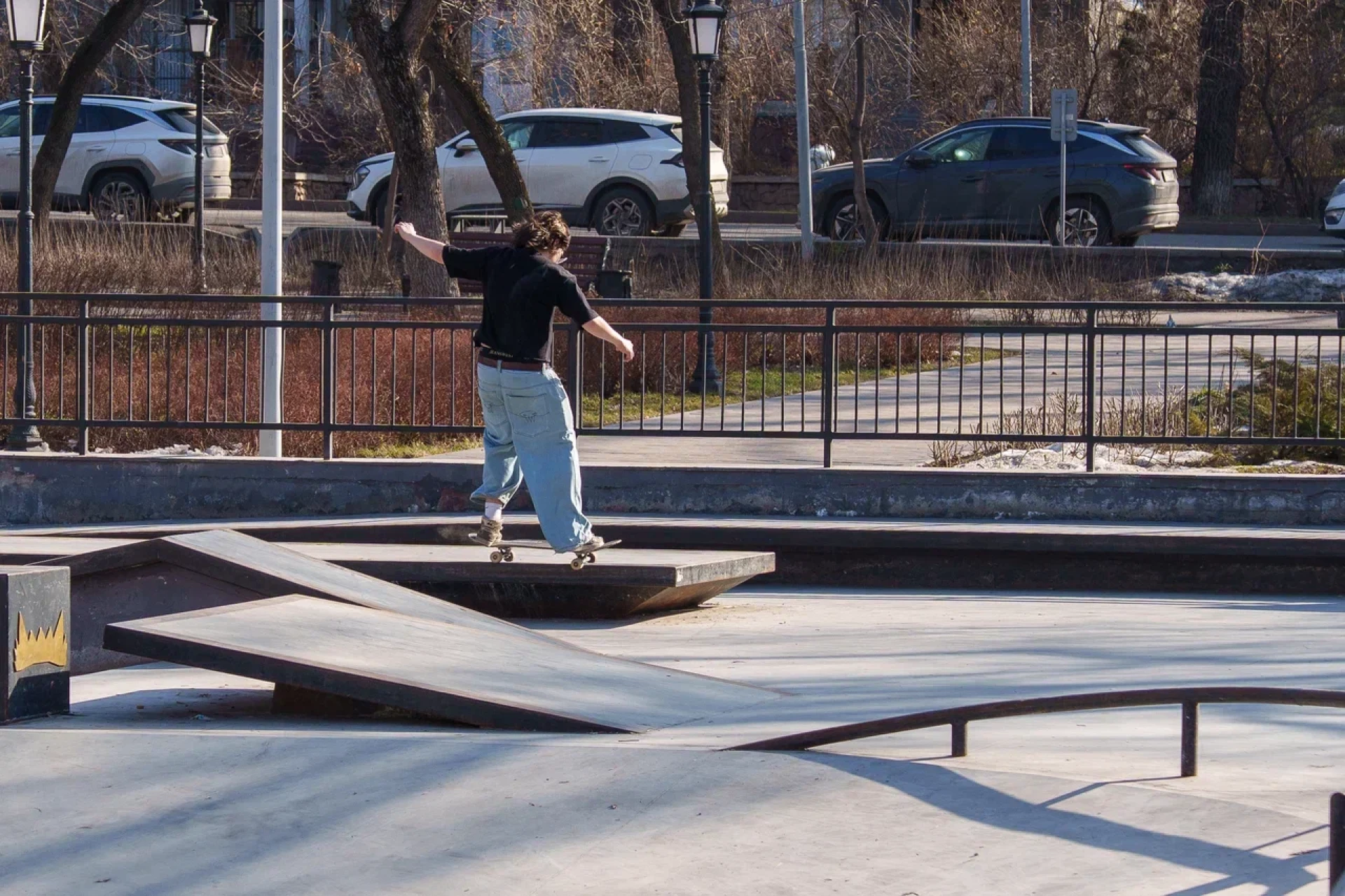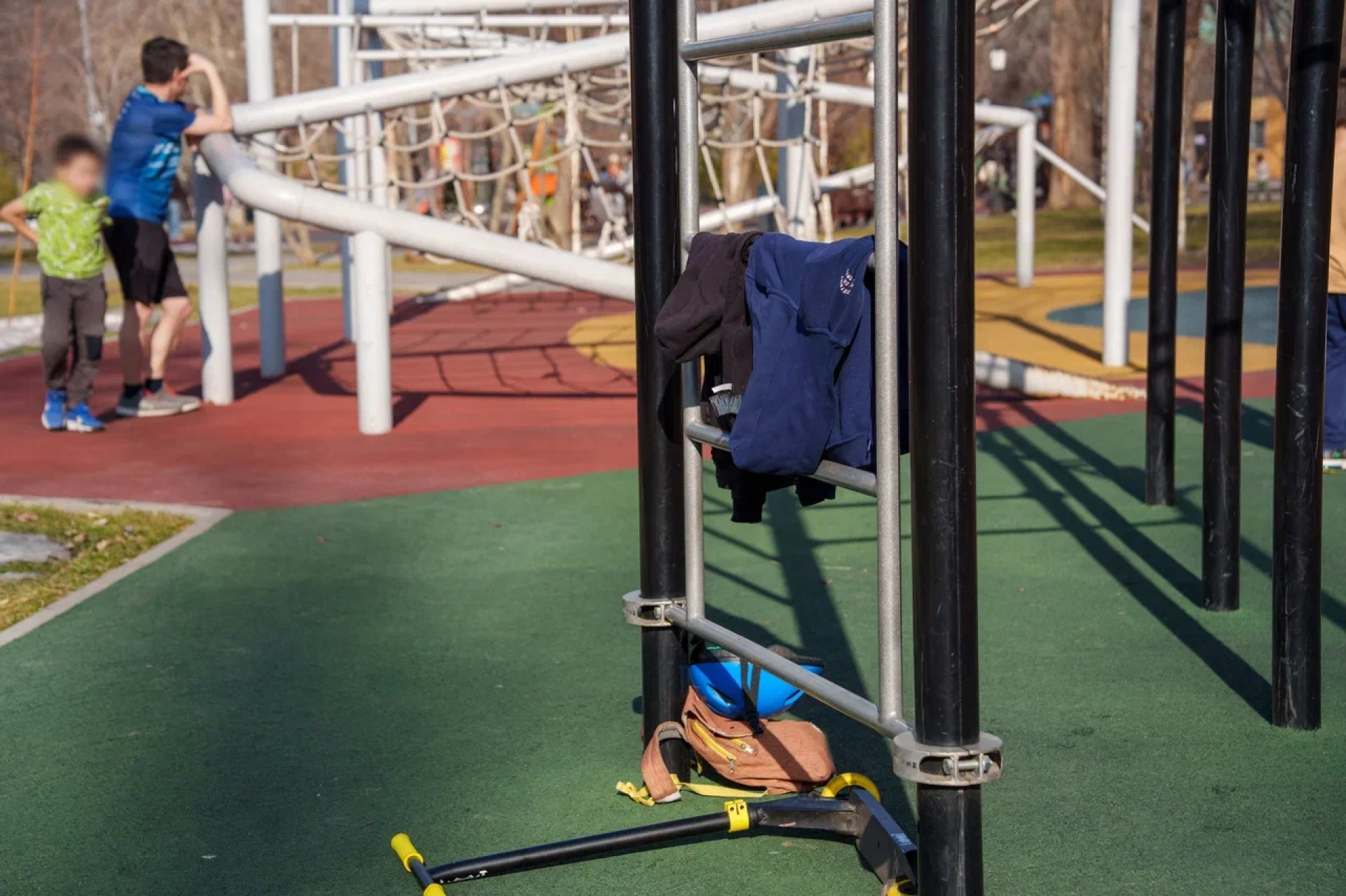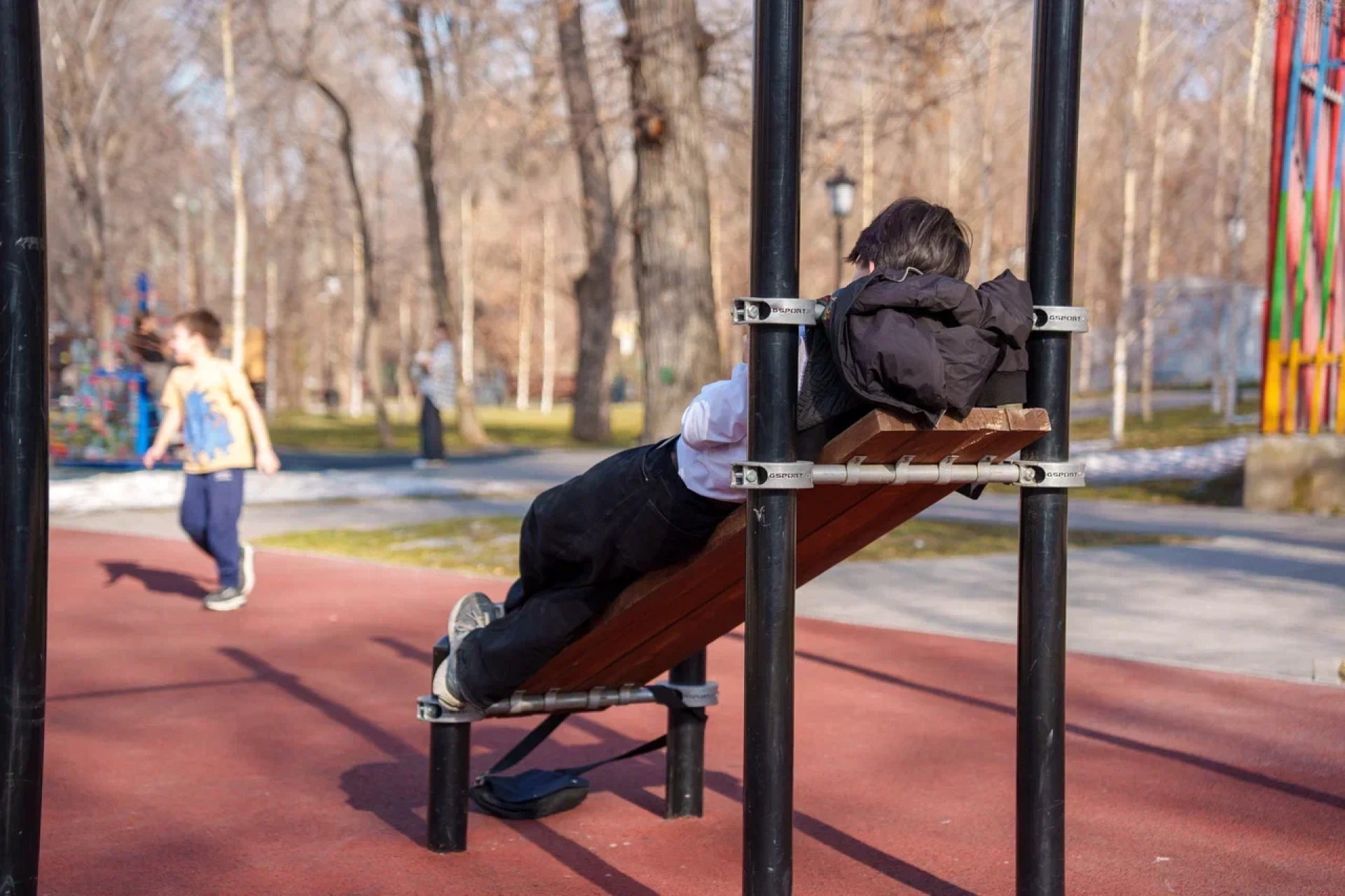На детских площадках — летняя атмосфера. Дети и подростки развлекаются на турниках, качелях и в скейт-парках, а их куртки и толстовки висят рядом – на перилах и спинках скамеек.