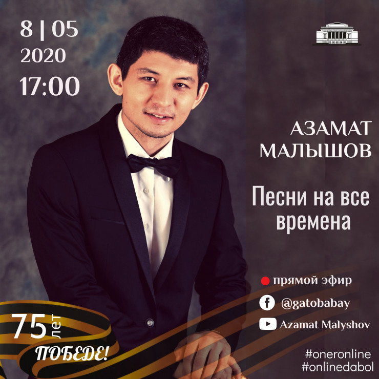 8 мая в 17.00 Азамат Малышов (бас) представит зрителям Home Onlinе Concert с программой "Песни на все времена" на аккаунтах Facebook (@gatobabay) и Youtube (Azamat Malyshov).