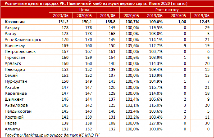 Среди крупных городов и мегаполисов пшеничный хлеб из муки первого сорта дороже всего обходился жителям Атырау (178 тенге за килограмм) и Актау (173 тенге за килограмм). Дешевле всего такой хлеб стоил в Алматы (132 тенге за килограмм) и Таразе (138 тенге за килограмм).