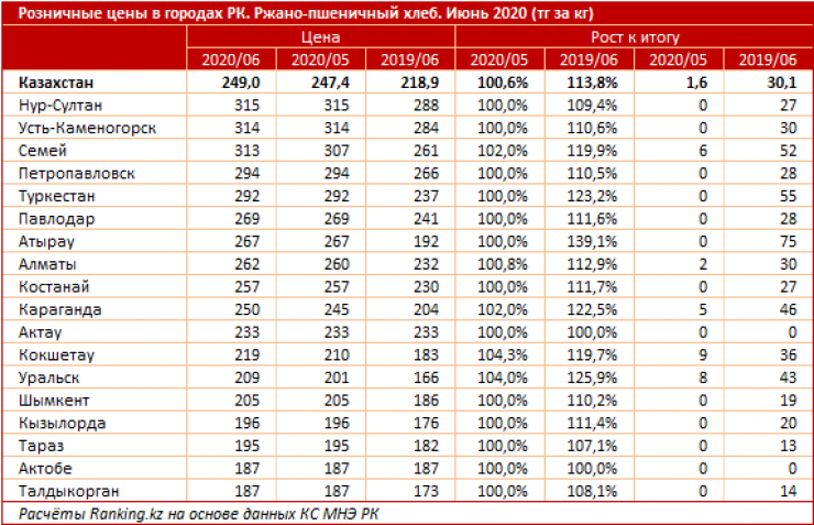 Ржано-пшеничный хлеб больше всего стоил в июне в Нур-Султане (315 тенге за килограмм), Усть-Каменогорске (314 тенге за килограмм) и Семее (313 тенге за килограмм). Дешевле всего его можно было купить в Актобе и Талдыкоргане (187 тенге за килограмм).
