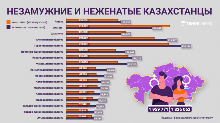 Лишь в Алматы количество свободных женщин (229 тысяч 697 человек) превышает количество свободных мужчин (188 тысяч 962 человека).