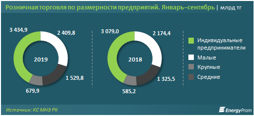 В разрезе размерности предприятий наибольшая доля в розничной торговле приходится на индивидуальных предпринимателей: 42,6 процента, объем торговли составил 3,4 триллиона тенге (годом ранее - 3,1 триллиона тенге).