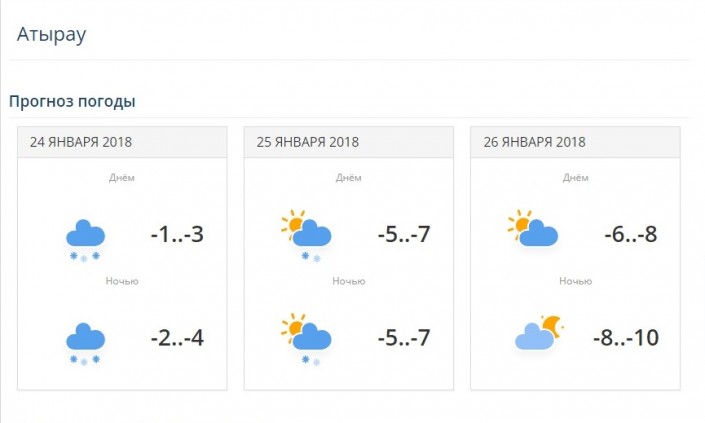 В двух городах на западе Казахстана - в Атырау и Уральске - выдалась относительно не холодная погода. В Атырау 24 января ожидается снег, -1...-3 градуса. 25 января и 26 января дневная температура понизится до 5-8 градусов мороза. В Уральске 24 января температура воздуха 3-5 градусов мороза. 25 и 26 января ожидается снег, дневная температура воздуха составит 8-10 градусов мороза.