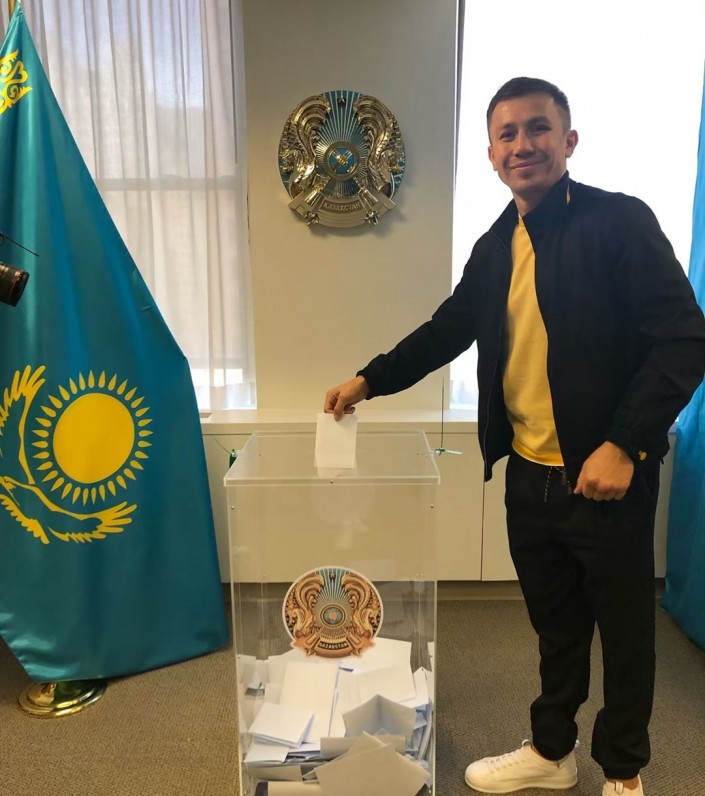 Казахстанский боксер Геннадий Головкин проголосовал на выборах президента Казахстана на избирательном участке в Нью-Йорке. Фотографию, на которой спортсмен опускает в урну избирательный бюллетень, он выложил в своем Instagram.