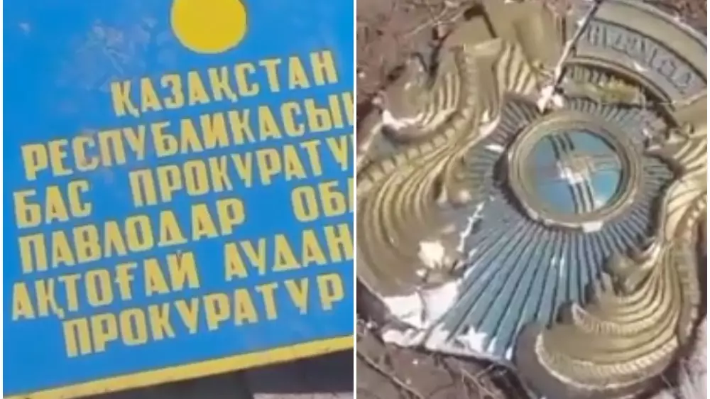 На видео, опубликованном в Instagram, видно, что в груде мусора лежит фасадная табличка прокуратуры Актогайского района. Рядом лежат два герба, один из которых разбит на части, а второй почти целый.