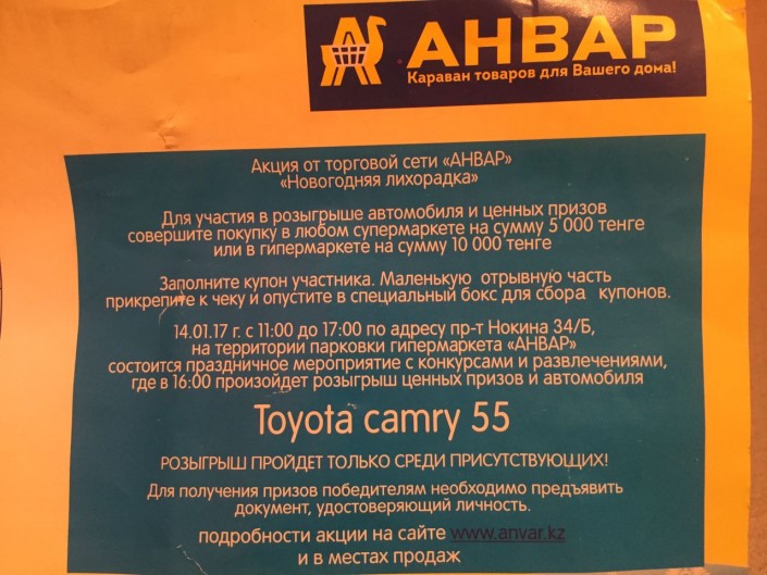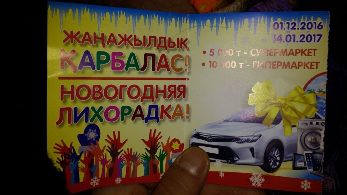 Согласно условиям конкурса, описанным на одном из буклетов, необходимо было совершить покупку на сумму от 5 до 10 тысяч тенге, заполнить купон участника и в условленное время прийти на мероприятие в гипермаркет по улице Нокина.