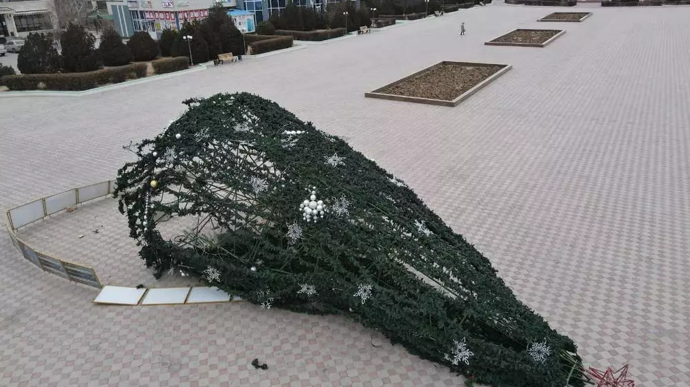 Елка упала на главной площади Актау из-за сильного ветра. Об упавшей в Актау елке на странице в Facebook рассказал блогер Азамат Сарсенбаев, передает Tengrinews.kz.