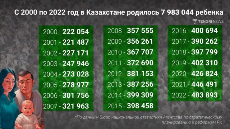 В Казахстане ежегодно растет уровень рождаемости. В 2021 году был достигнут рекорд: на свет появился 446 491 младенец. Коэффициент рождаемости тогда составил 3,32, обозначающий, что в стране на одну женщину приходится в среднем более 3 детей.