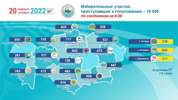 "По состоянию на 08.00 по времени столицы, согласно оперативным данным, которые предоставлены территориальными избирательными комиссиями областей, городов Астаны, Алматы и Шымкента, голосование началось на всех 10 033 избирательных участках на территории Казахстана и на 17 участках в 16 иностранных государствах. На 51 избирательном участке за границей голосование начнется с учетом разницы часовых поясов", - сообщил секретарь ЦИК Мухтар Ерман.