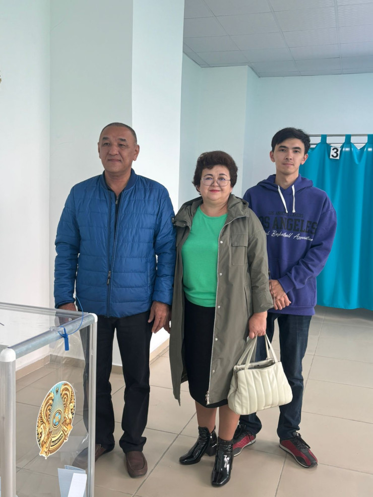 Семья Бердимуратовых, также активно участвующая в голосовании, представляет собой пример преданности своей профессии и сообществу. Марат Сабыржанович, хирург и главный врач районной больницы, и Шырак Кайрошевна, терапевт дневного стационара, работают в медицине более 30 лет. Их сын Талгат, следуя по стопам родителей, уже два года трудится в хирургическом отделении.