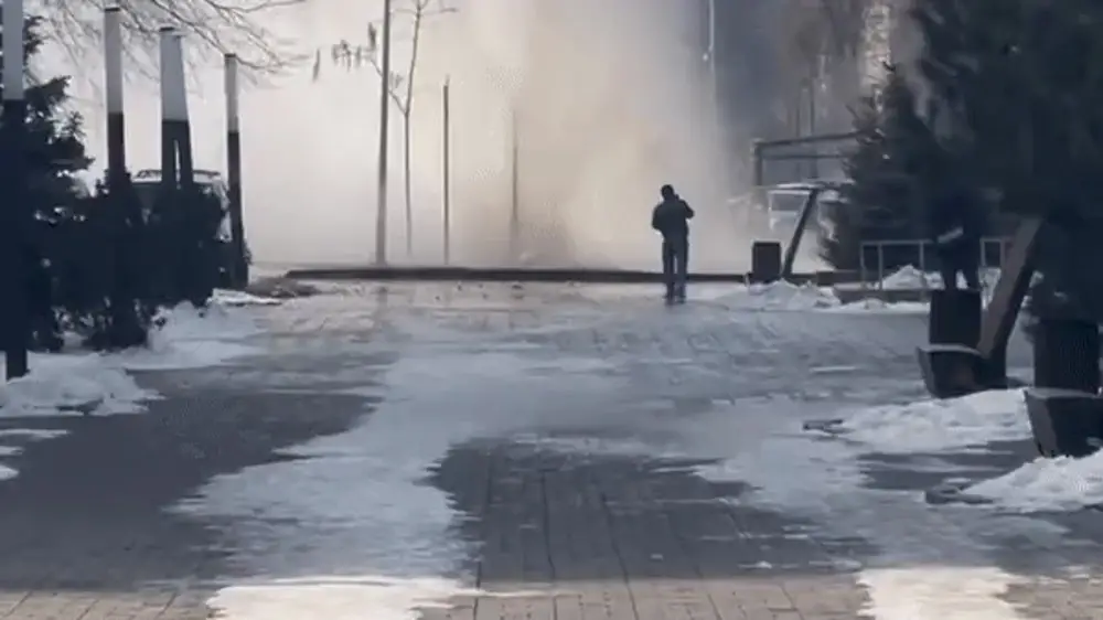 В соцсетях появилось видео бьющего из-под земли по улице Тулебаева фонтана из горячей воды и пара.
