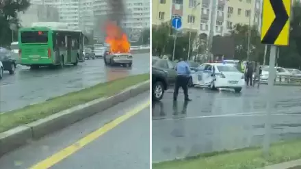 "По инерции патрульная машина столкнулась с Mercedes, двигавшимся на восток. В результате столкновения один из полицейских из состава экипажа получил серьезные телесные повреждения и экстренно был госпитализирован в городскую клиническую больницу № 7. Полыхавший Nissan остановился в результате наезда на полицейское авто, которое, приняв удар на себя, стало барьером для неуправляемого транспортного средства. Иначе последствия могли быть более серьезными и необратимыми", - пояснили в ДП Алматы.