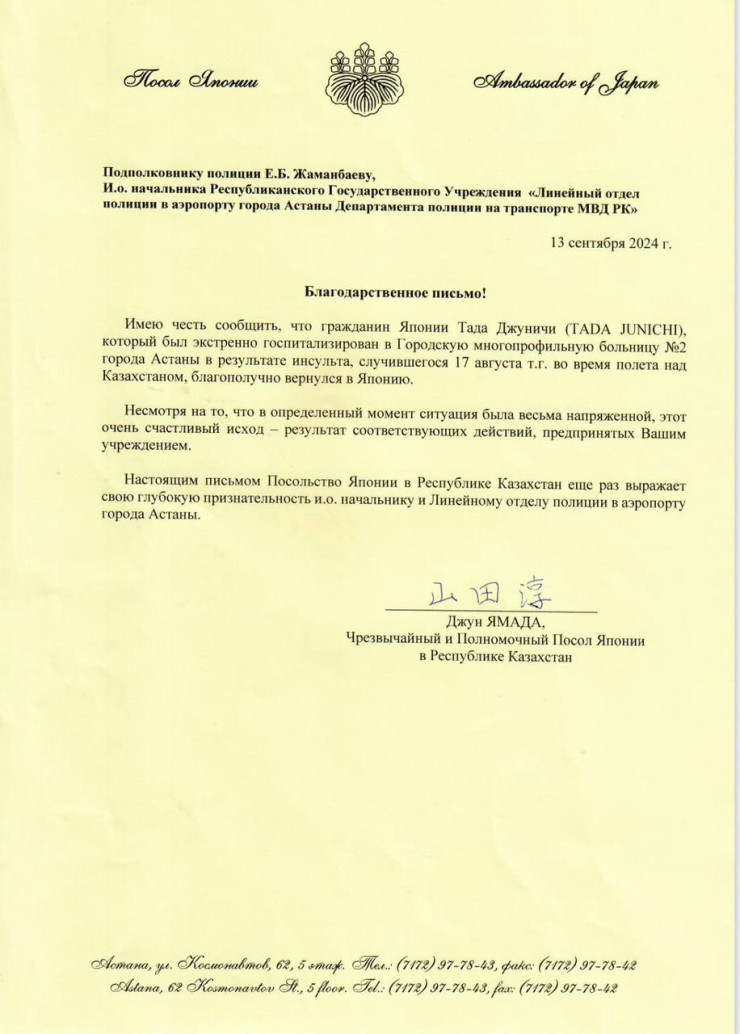 "Имею честь сообщить, что гражданин Японии Тада Джуничи, который был экстренно госпитализирован в городскую многопрофильную больницу №2 города Астаны в результате инсульта, случившегося 17 августа текущего года во время полета над Казахстаном, благополучно вернулся в Японию", - говорится в благодарственном письме посольства.
