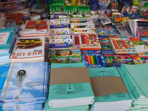 Тонкие тетради на алматинских базарах и школьных ярмарках можно приобрести от 15 тенге за штуку, а общие тетради -по 80 тенге и дороже. Альбом для рисования стоят от 150 тенге в зависимости от количества страниц. Тканевые пеналы - от 400 тенге, пластилин - от 250 тенге. Набор обложек для книг (20 штук) от 250 тенге и выше. Самые дешевые рюкзаки на рынке стоят 2500 тенге. Дневники стоят от 200 тенге.
