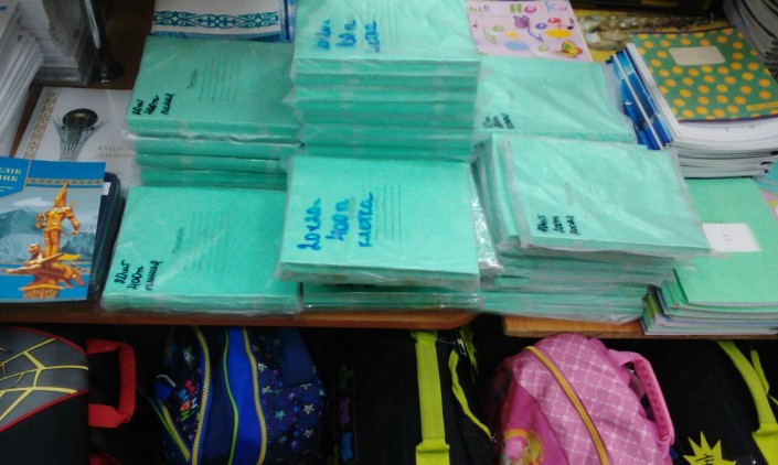 Тонкие тетради стоят от 12 до 15 тенге за штуку, общие тетради от 70 до 150 тенге, дневники от 200 до 500 тенге, упаковка обложек для тетрадей 300 тенге, для книг 450 тенге за 10 обложек.