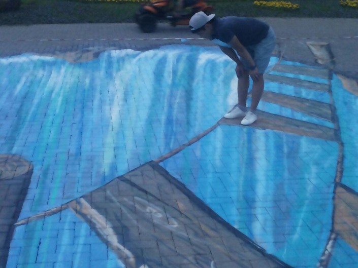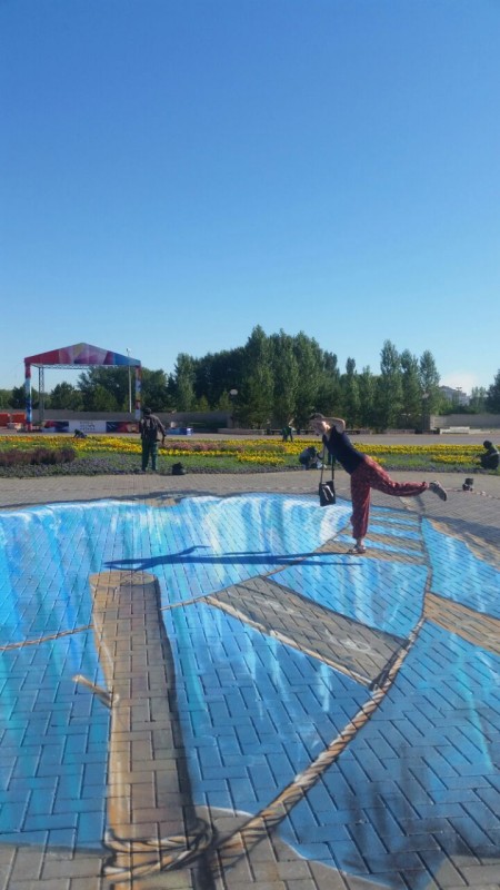 "По задумке этот рисунок показывает то, как будто брусчатка провалилась под землю откуда возникает водопад. Но есть мостик, по которому можно пройти расстояние. Единственное - данный рисунок сможет продержаться лишь один сезон. Но на следующий год мы планируем провести в одном из парков Астаны фестиваль 3D-рисунков. И подобных рисунков будет больше", - отметил Гани Хасенов.