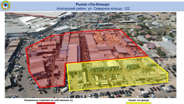 - "Уш Коныр" - общая торговая площадь составляет 6200 квадратных метров, незаконные объекты занимают 4997 квадратных метров, а захват земель госфонда составляет 1242 квадратных метра;