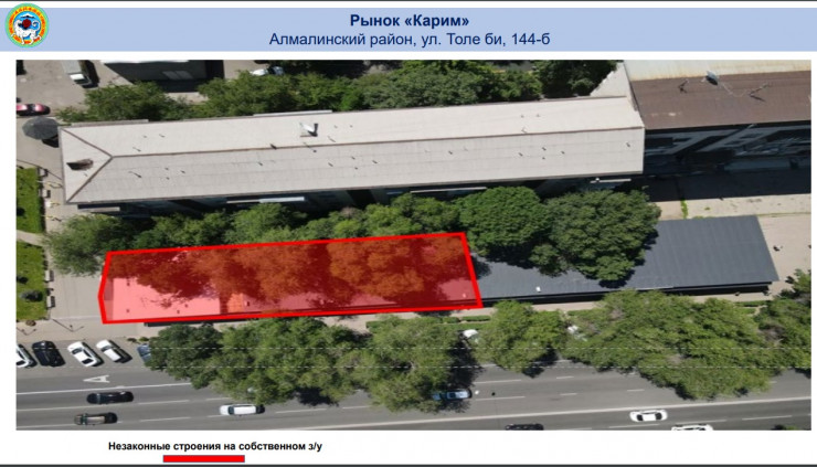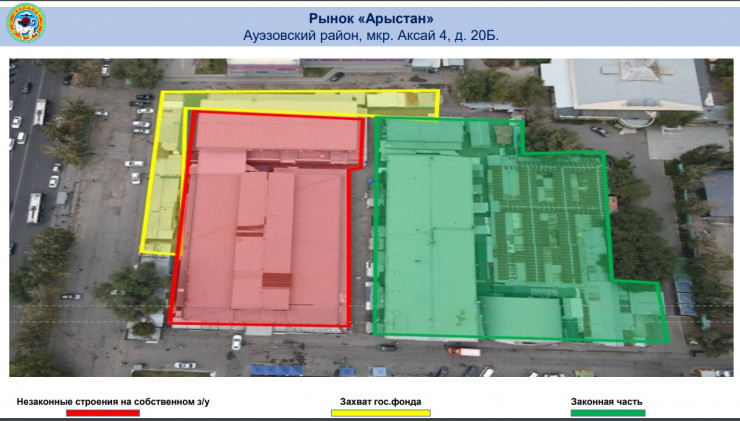 - "Арыстан" - общая торговая площадь составляет 7753 квадратных метра, незаконные объекты занимают 2143 квадратных метра, а захват земель госфонда составляет 505 квадратных метров;