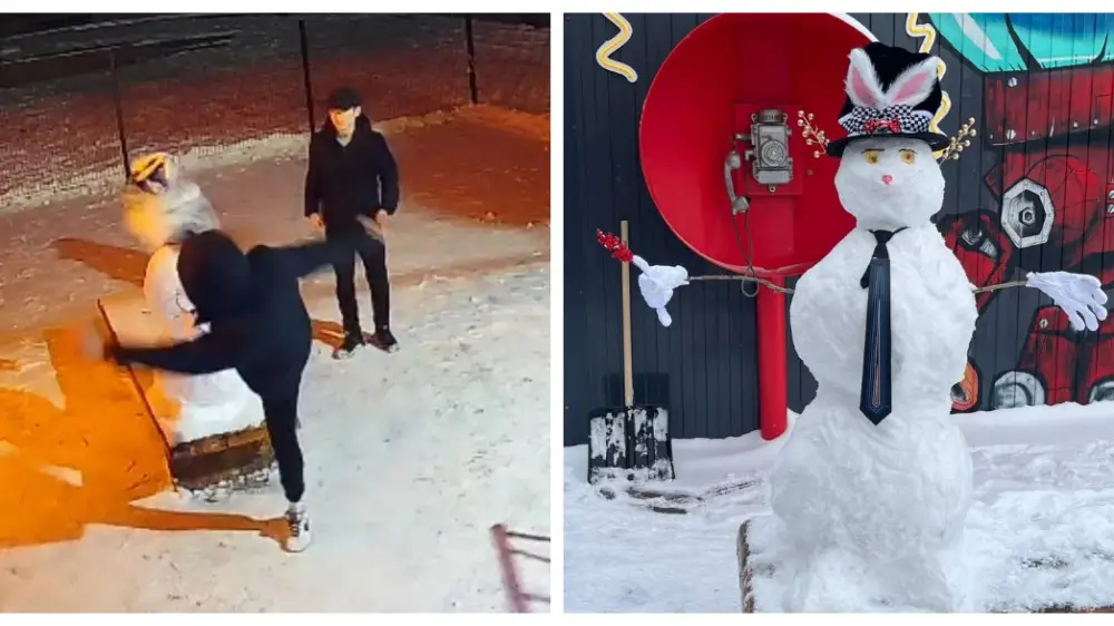 Молодые люди зашли на территорию аттракциона, подошли к рекламному стенду и начали пинать его. Затем они направились к снеговику, который был установлен рядом. Один из них ударил снеговика ногой по голове и снес её, после чего оба сразу убежали.