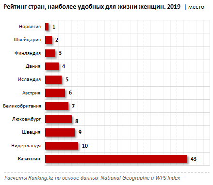 Казахстан занял 43-е место среди 167 стран. При этом он расположился выше ОАЭ и ниже Ямайки, но занял первое место среди стран Центральной Азии, Центральной и Восточной Европы по уровню оплаты труда женщин.
