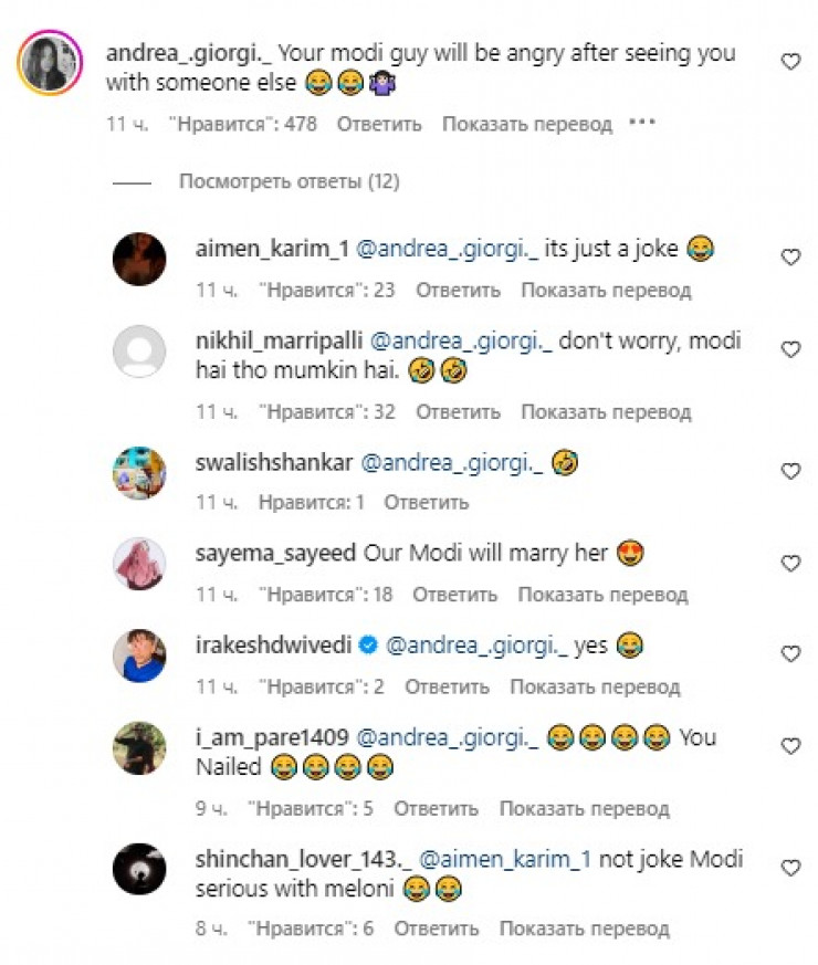 Ранее итальянский политик опубликовала фотографию с Президентом Казахстана Касым-Жомартом Токаевым. В комментариях к публикации пользователи из Индии вспоминают своего премьер-министра Нарендру Моди.