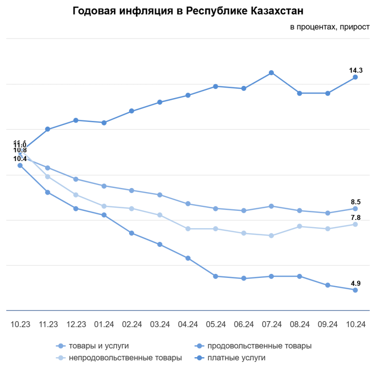 В региональном разрезе в октябре 2024 года в годовом выражении уровень инфляции, превышающий среднереспубликанский, сложился в десяти регионах, из них наибольший - в Астане (10,2 процента), в Мангистауской области (9,7 процента), в Алматы и Западно-Казахстанской области (по 9,4 процента).