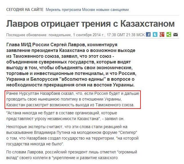 Позже, 1 сентября, на сайте Министерства иностранных дел России появилась новая публикация - ответ главы ведомства Сергея Лаврова на вопрос информационного агентства "Интерфакс". При этом вопрос министру был сформулирован так: "Как вы расцениваете заявления Президента Казахстана Н. А. Назарбаева о том, что если Россия будет и дальше проводить свою политику в отношении Украины, то Астана рассмотрит возможность выхода из Таможенного союза?". Как известно, в контексте заявления Президента Казахстана не было речи о выходе из Таможенного союза и не упоминались события на Украине. Добавим, что Лавров все-таки ответил на этот вопрос и его комментарий был корректным, согласно позиции российских властей.