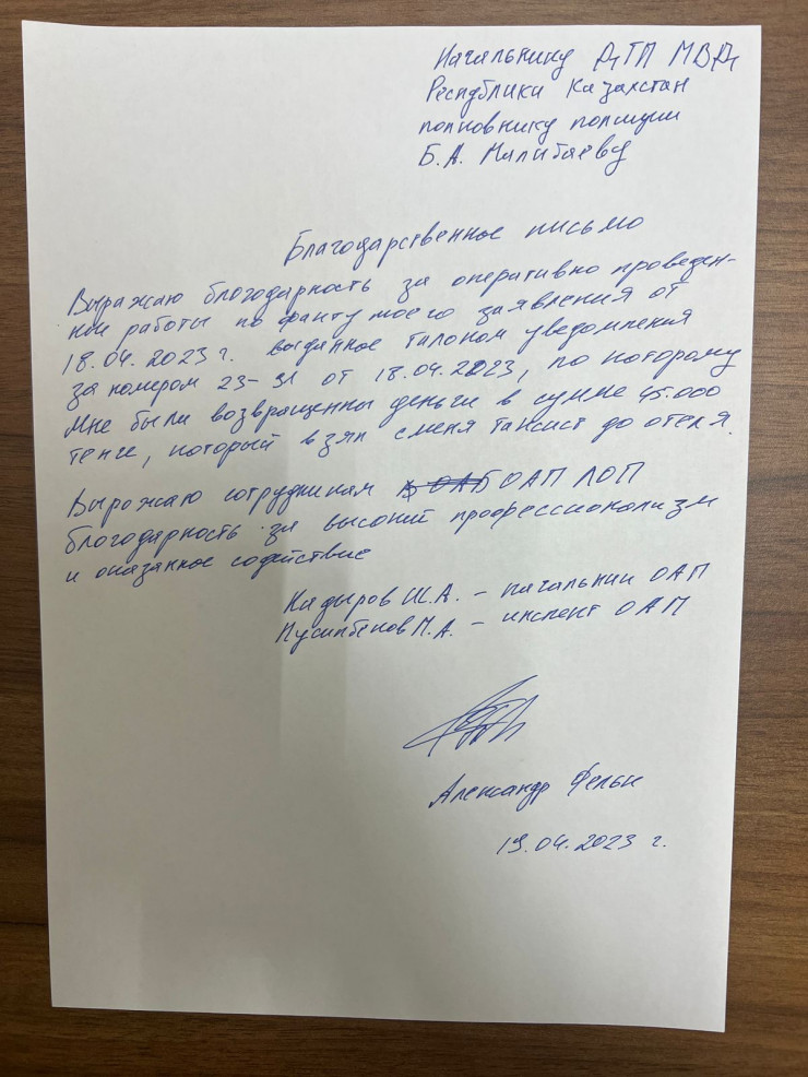 В этой связи редакция Tengrinews.kz обратилась за комментариями в Департамент полиции на транспорте, к которому относятся все службы полиции при аэропортах. В ведомстве обещали разобраться и позже прокомментировать данный случай. После этого Александр Фельк вновь связался с журналистами и сообщил, что получил звонок от полиции с приглашением в отдел на опознание, так как предполагаемый таксист "уже найден и задержан", поэтому он направился в аэропорт. Спустя полчаса иностранец рассказал, что "расследование закрыли, виновника нашли, деньги в размере 45 тысяч тенге вернули".