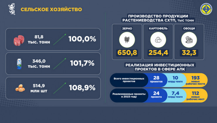 В Карагандинской области завершено 24 проекта в сфере агропромышленного комплекса. Всего реализуется 28 инвестиционных проектов на 10 миллиардов тенге. Будет создано 193 рабочих места.