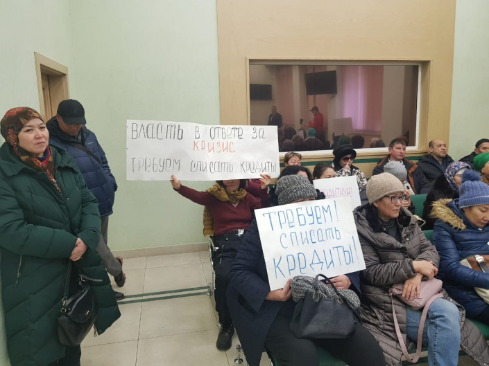 Около 60 долларовых ипотечников пришли с плакатами в здание Национального банка в Алматы. Люди требуют списать им кредиты и реализовать кредитную амнистию, передает корреспондент Tengrinews.kz.