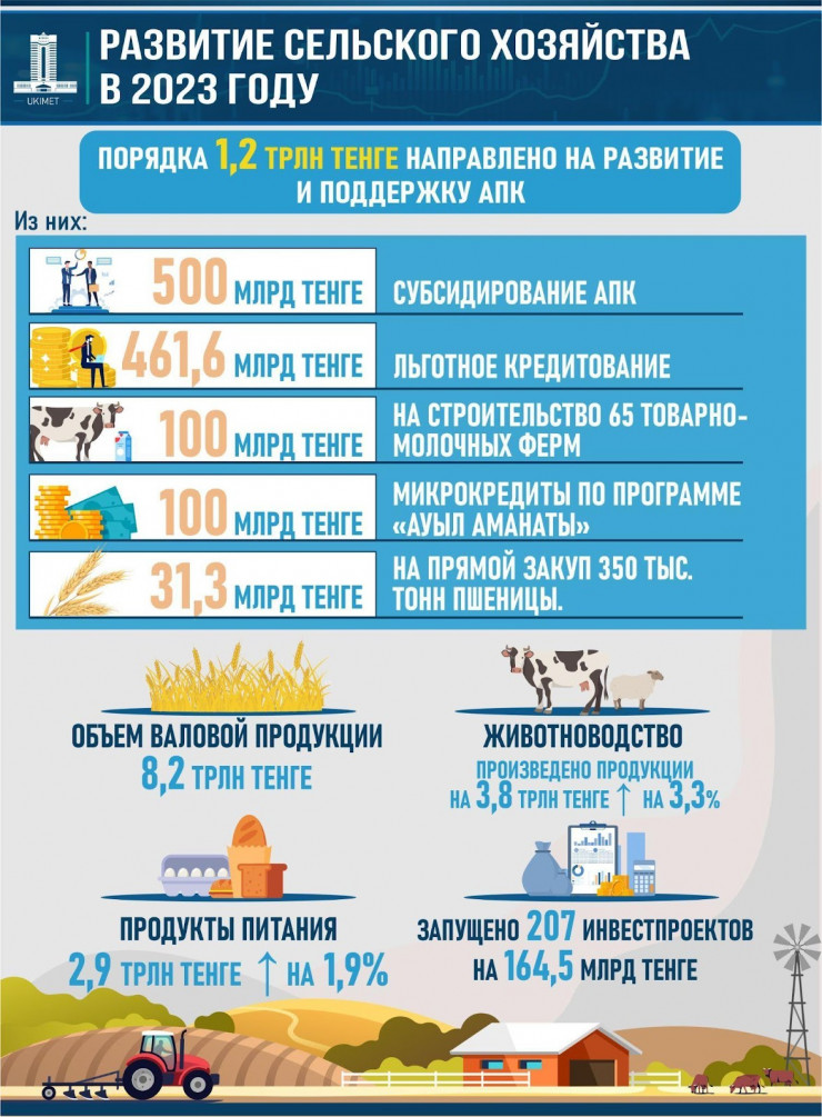 Благодаря государственной поддержке увеличивается приток инвестиций в отрасль. С начала 2023 года в отечественном АПК запущено 207 инвестиционных проектов на 164,5 миллиарда тенге.