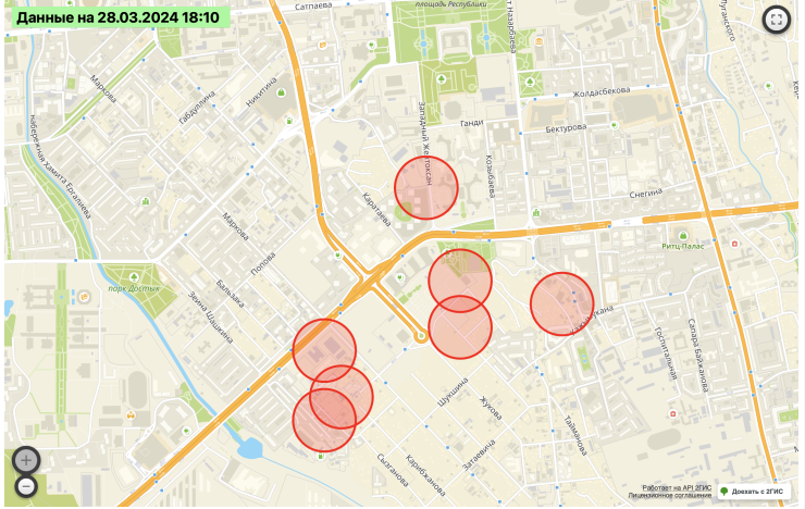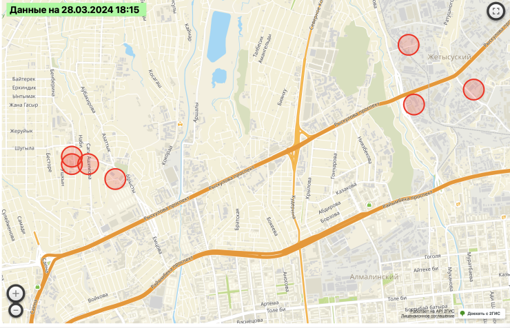 "Дождь и падение деревьев привели к отключению в распределительной сети 6-10-0,4 кВ, в результате чего от электроснабжения были отключены потребители Алматы. Отключения произошли в микрорайонах Акжар и Тастыбулак. Ожидаемое время включения - 2 часа. Оставшиеся без электроэнергии районы можно посмотреть на карте", - сообщили в компании "Алатау Жарық Компаниясы".