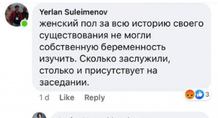 Публикацию прокомментировал сотрудник Евразийского национального университета Ерлан Сулейменов. Он написал: "Женский пол за всю историю своего существования не мог собственную беременность изучить. Сколько заслужили, столько и присутствует".