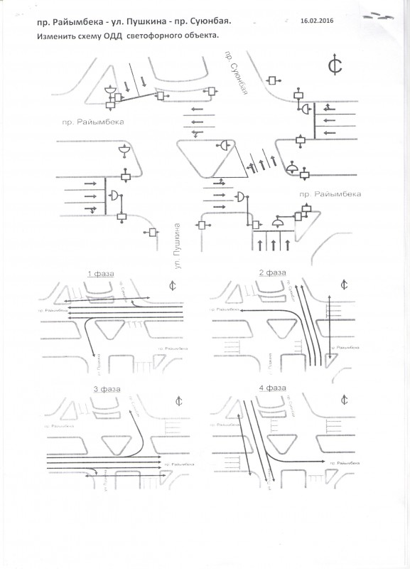 Теперь движение на данном участке будет организовано следующим образом: сначала транспорт идет: по Райымбека с востока на запад прямо с поворотом налево, по Суюнбая с юга на север прямо с поворотом налево, по Райымбека с запада на восток прямо с поворотом налево, по Суюнбая с севера на юг прямо с поворотом налево, потом цикл повторяется.